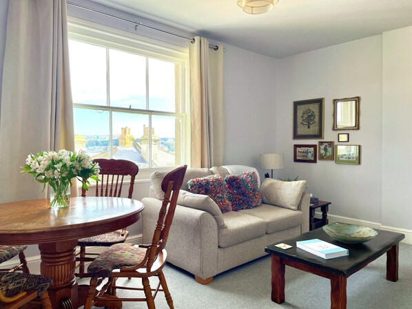 Step into the bright and airy lounge diner where you'll find a comfy sofa bed, complete with a double mattress and topper for extra snugness. You’ll find a dining table with chairs for four people, perfect for enjoying meals together or planning your adventures. Dive into your favourite shows on the smart TV with apps such as Netflix, or stay connected with our complimentary Wi-Fi. And don't forget to take in the delightful views across the town from the large window offering glimpses of the castle ruins in the distance.