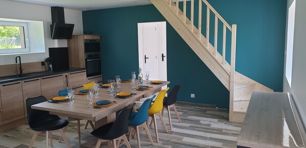 Pour vous accueillir, au RDC, un grand séjour avec une cuisine entièrement équipée, de nombreux rangements, un salon TV " cocooning", une salle de bain avec douche, un WC indépendant et un petit débarras.