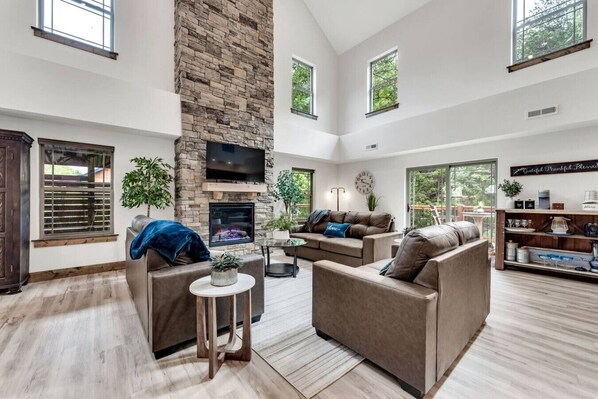 Creekside is beautifully and tastefully decorated to offer you a home away from home atmosphere. A large living space, fully stocked kitchen, and four King Bedrooms each with its own private bathroom. Each bedroom has a television and a unique area dedicated to hair and make up. Two sofa couches gives Creekside the ability to easily sleep twelve guests.