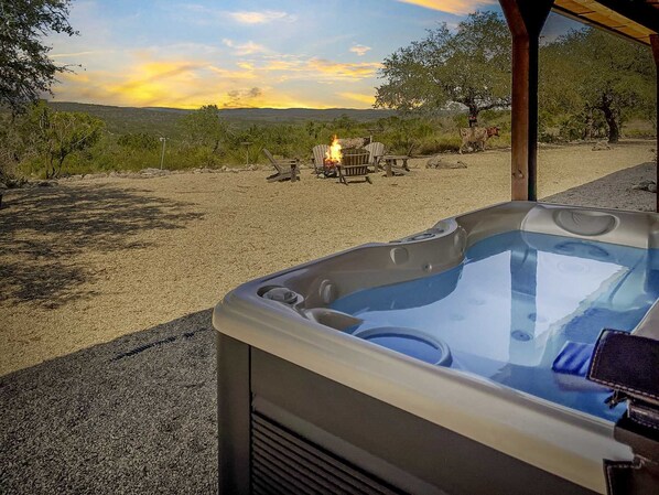 A firepit overlooking the Hill Country offers a charming outdoor space for relaxation and socializing.