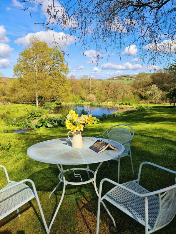 The kitchen is a lovely traditional Devon country kitchen with pine table and Aga (there is also an electric oven and hob). It has a delightful window seat overlooking the garden and ponds.