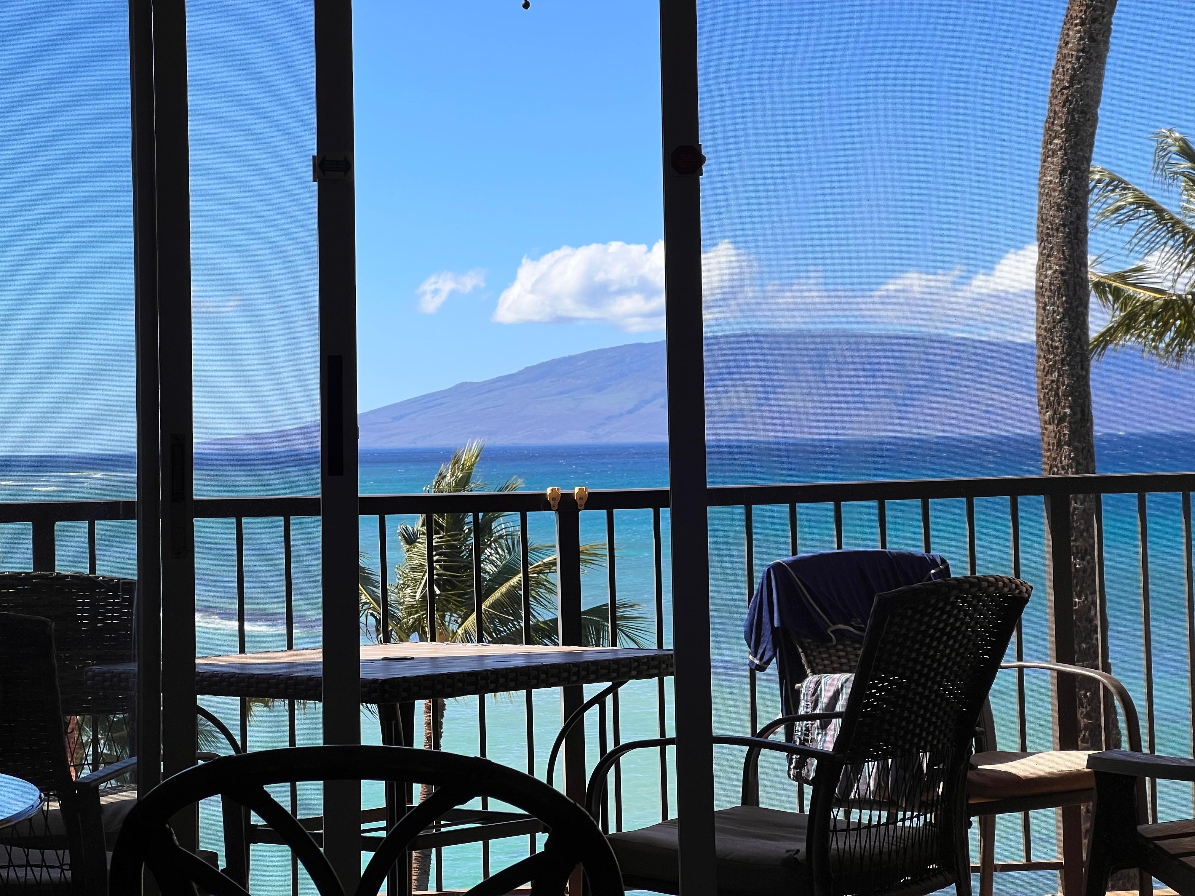 Direct and expansive ocean views, a full view of the island of Lana'i, all the colors of the ocean, spectacular sunsets, beautiful swaying palm trees, views up and down the coastline and reef-surfing sea turtles are just a few of the daily sights you'll enjoy from this top floor, oceanfront condo located just past the resort community of Ka'anapali. Situated on the ocean side of Lower Honoapiilani Road, and just three units in from the shoreline, you will fall asleep and wake up to the soothing sounds of the ocean. You'll love the cool trade winds blowing right through the unit.