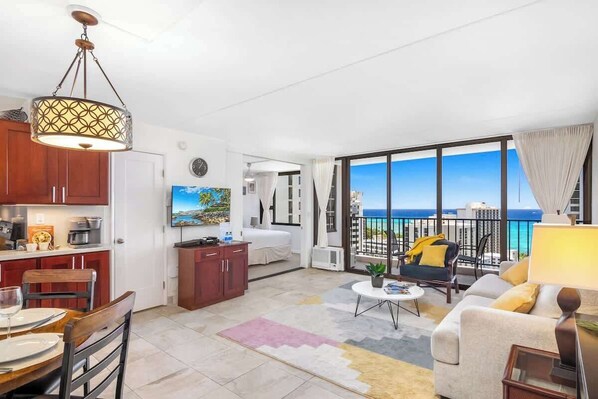 The living room features a pull-out sleeper sofa, a 50'' Smart TV, and a dining table for up to four, while the bedroom sports a king-size bed and a ceiling fan for your ultimate comfort. The full bathroom features a walk-in shower with a hand-held shower wand.