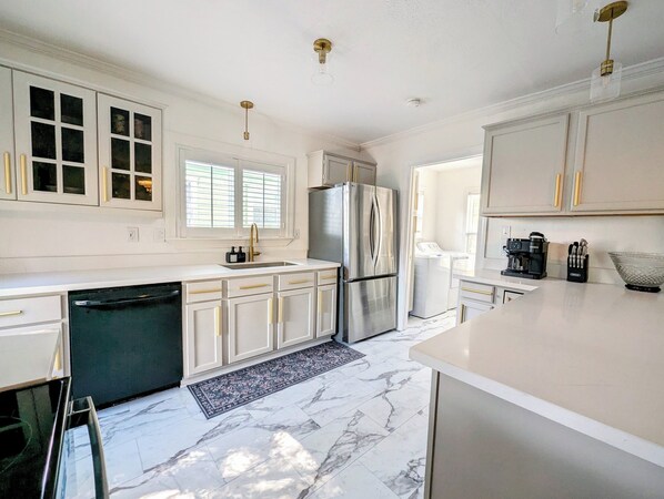 Natural light flows throughout the house, highlighting the elegant, stylish, and upscale touches across the home. The kitchen is fully stocked with cooking essentials, coffee machine, cookware, utensils, blender, cutting board, and more. The living room has a 65" 4K smart TV while the dining area has comfortable seating for the entire family. We also welcome the pups!