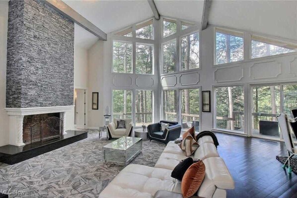 -Two-story decorative stone fireplace & multiple living spaces