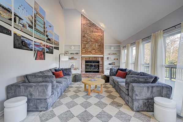 Victory Lane on Hampton is a spacious, fun 5 bedroom home perfect for large groups in Indianapolis. Its unique design offers luxurious furnishings, a game room with pool table and arcade, and spacious living areas to relax. A fully stocked kitchen lets you cook up your favorite meals while the coffee bar provides an extra boost.