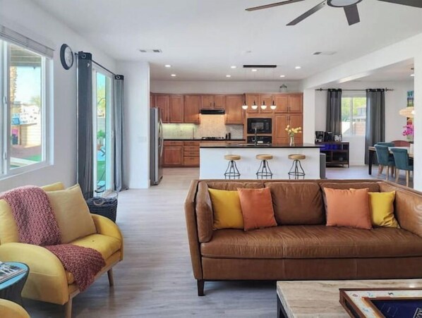 Welcome to Desert D'or in Terra Lago, Indio. Enjoy a stylish & unique floor plan with a newly renovated kitchen featuring stainless steel appliances, black quartz countertops and a custom tile backsplash. The breakfast bar has seating for 3 and the dining table seats 6 comfortably. Enjoy your favorite Netflix series on an 85" HDTV & soundbar in the living room.