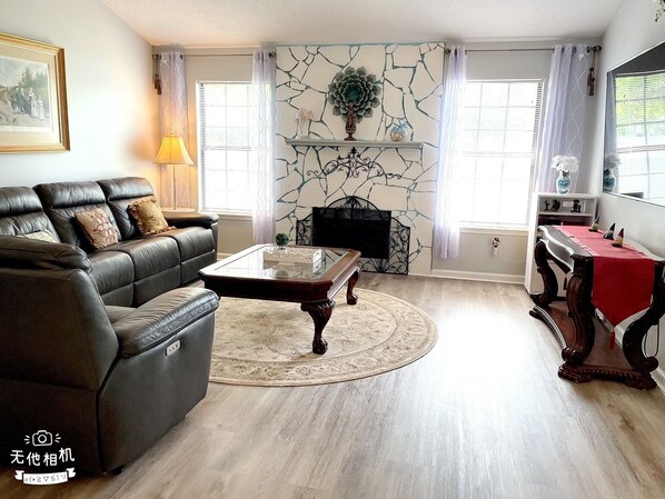 Located on a quiet cul-de-sac, the driveway has off street parking for 3 cars. Each bedroom has a tv powered by Roku. The Living Room has a giant 75" tv powered by LG's WebOS and a fireplace with electric log. Hundreds of channels from LG are included with it. Family room has a 48" TV.