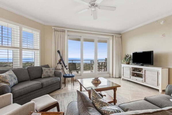 Wake up to sunrise views from the private balcony, unwind in the spacious living area, and prepare meals in the fully equipped kitchen. The primary suite features a king bed, ensuite bath, and ocean views, while the second bedroom also offers a king bed for equal comfort.