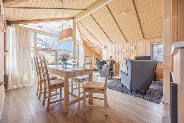 The cottage has a large barrier-free living and dining area with open kitchen. The room is furnished with a large woodburning stove, a cozy Danish-style sofa corner and a spacious dining table for 6 people. There is also a TV with DVD player, a music system and Wi-Fi.
