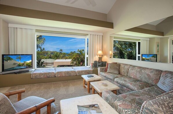 メインリビングエリアには、広大なハイビームの天井があり、マウイの海岸から吹き抜ける素晴らしい空気の流れを作り出しています。 非常に広々としていて、屋外をリビングルームとキッチンに持ち込みます! このユニットは、非常に人気の高い複合体に位置しています。 ハワイの家具はリラックスした滞在のための快適な雰囲気を加えています。 オーシャンビュープールとクラブハウスで日光浴をしながら、トロピカルドリンクを飲みながら素晴らしい午後を思い浮かべてください。