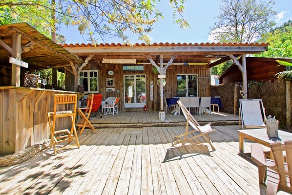 Delicately placed among the pines of the 44 hectares, this attractive colorful hut is completely covered with old wooden planks. The interior design reflects this same passion for wood, which gives this home the appearance of an adventurer's hut. It will seduce you as much by its authenticity as its privileged location in the heart of 44 Hectares, close to the basin. In this house you will live in harmony with nature and you will not need to move other than by bike or on foot. The calm that dominates in this house will allow to spend warm moments with family or friends. An awning will also allow you to eat on the terrace of 30m2 in the shade or sheltered from bad weather. Finally, you will have available 3 bikes thanks to which the amenities, shops and restaurants will all be less than 10 min.