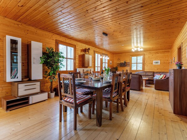 Ground floor: open kitchen with toaster, cooker(4 ring stoves), hood, coffee machine(filter), oven, microwave, dishwasher, fridge-freezer , Living/diningroom with double sofa bed, TV, dining table(8 persons), decorative fireplace, radio, CD player, stereo unit , bedroom with double bed , bedroom with bunk bed, bunk bed , bathroom with massage shower, washbasin, toilet , heating(heat pump), terrace(private)