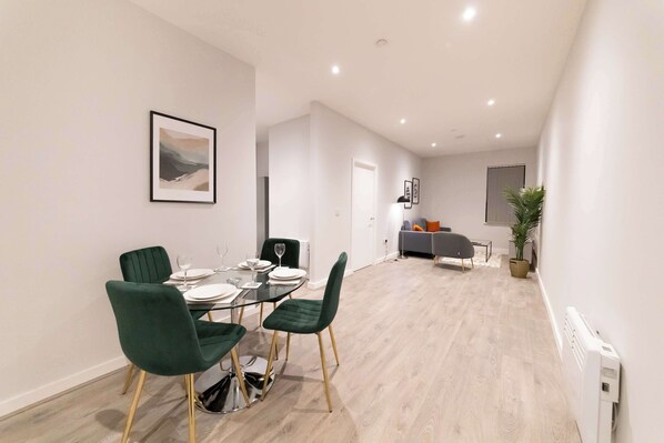 The interior is finished to a high standard, featuring plush furnishings and modern appliances throughout. The open-plan living area includes a fully equipped contemporary kitchen with everything needed for home-cooked meals, a dining table, a cosy sofa, an armchair, and a smart TV. High-speed broadband is available throughout the apartment.