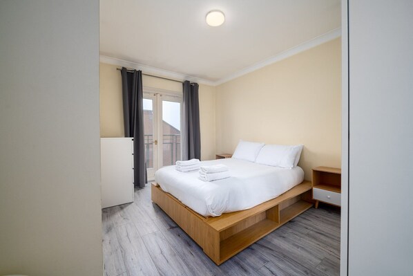 The bedroom features a double bed with complimentary hotel-quality linens for maximum comfort, a spacious wardrobe for convenient storage, and a small balcony where you can enjoy a cup of coffee in the mornings.