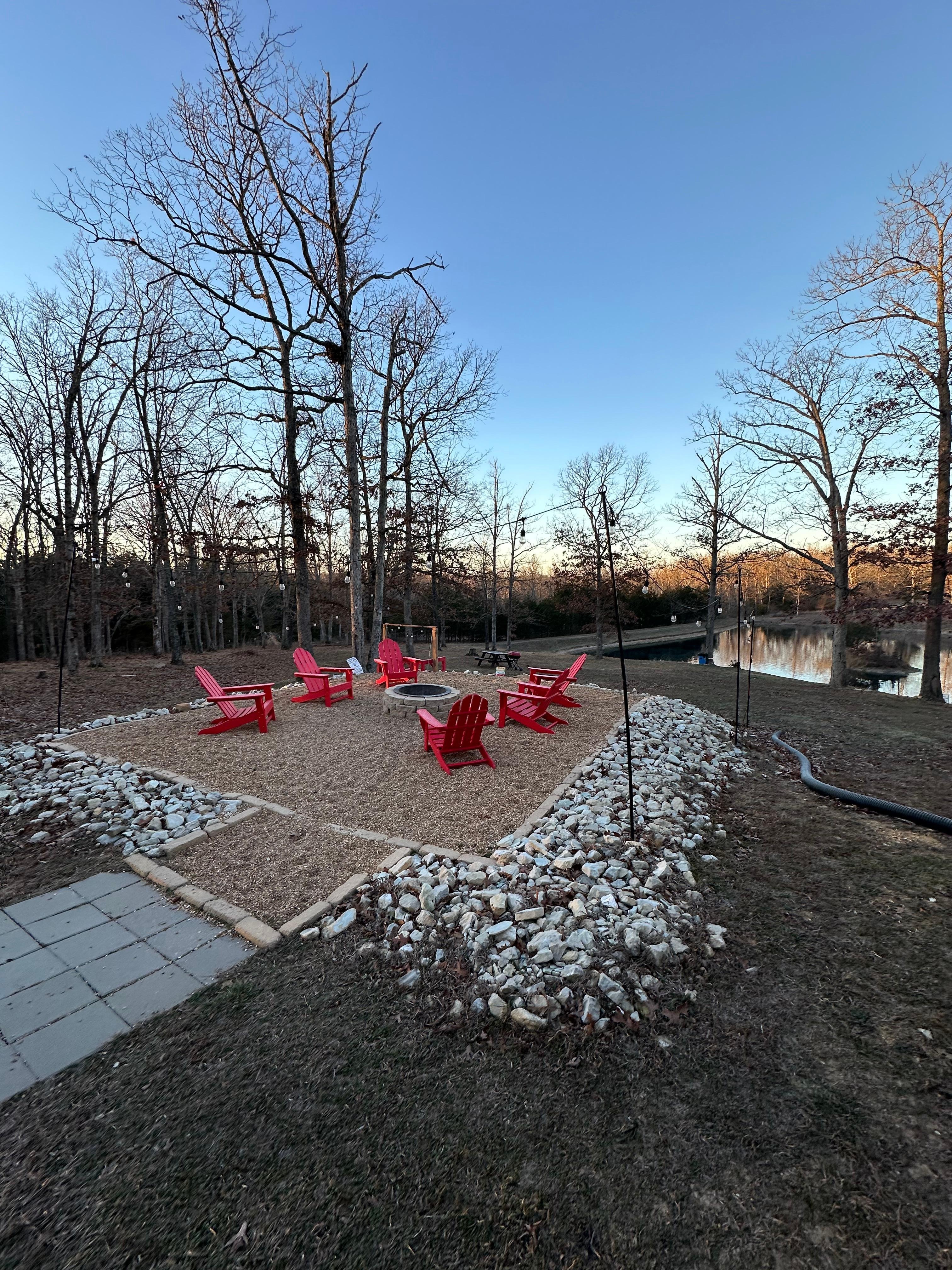 Enjoy the spacious fire pit overlooking the lake. Perfect for s'mors and making memories with family / friends. Woods provided.