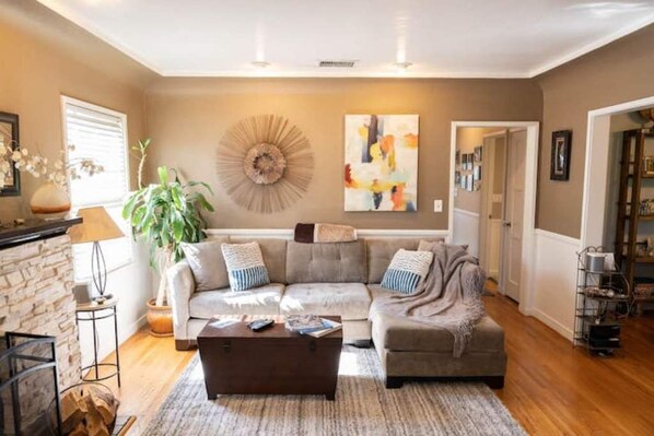 You enter to a bright comfortable living room with floor to ceiling picture windows looking out to a greenery-enclosed front yard. The living room has a big soft comfortable couch, white stone fireplace next to a 55 in TV with Sono speaker surround sound throughout the living room. Formal dining room, 2 bedrooms with kingsize and queenside beds. The couch and a blow up mattress are the other sleeping areas. Full kitchen that was actually featured on HGTV's "Over Your Head" (A show from years ago) that installed a farm sink, cement counter tops and Stainless Steel Subway Tiles.
