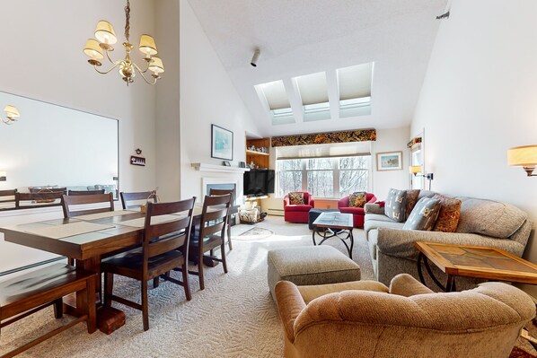 There are plenty of hooks, cubbies, and a boot bench in the entryway for easy gear removal and storage. Light streams into the living area through a large window and skylights, with a wood-burning fireplace, comfortable seating, and a smart TV furnished for toasty home leisure. The covered balcony offers a scenic perch for coffee or cocktails. You'll find the kitchen well-appointed to handle everything from on-the-go snacks to full-on family feasts. Enjoy your meals in the dining area or step out onto the deck or balcony to take in the stunning mountain views.