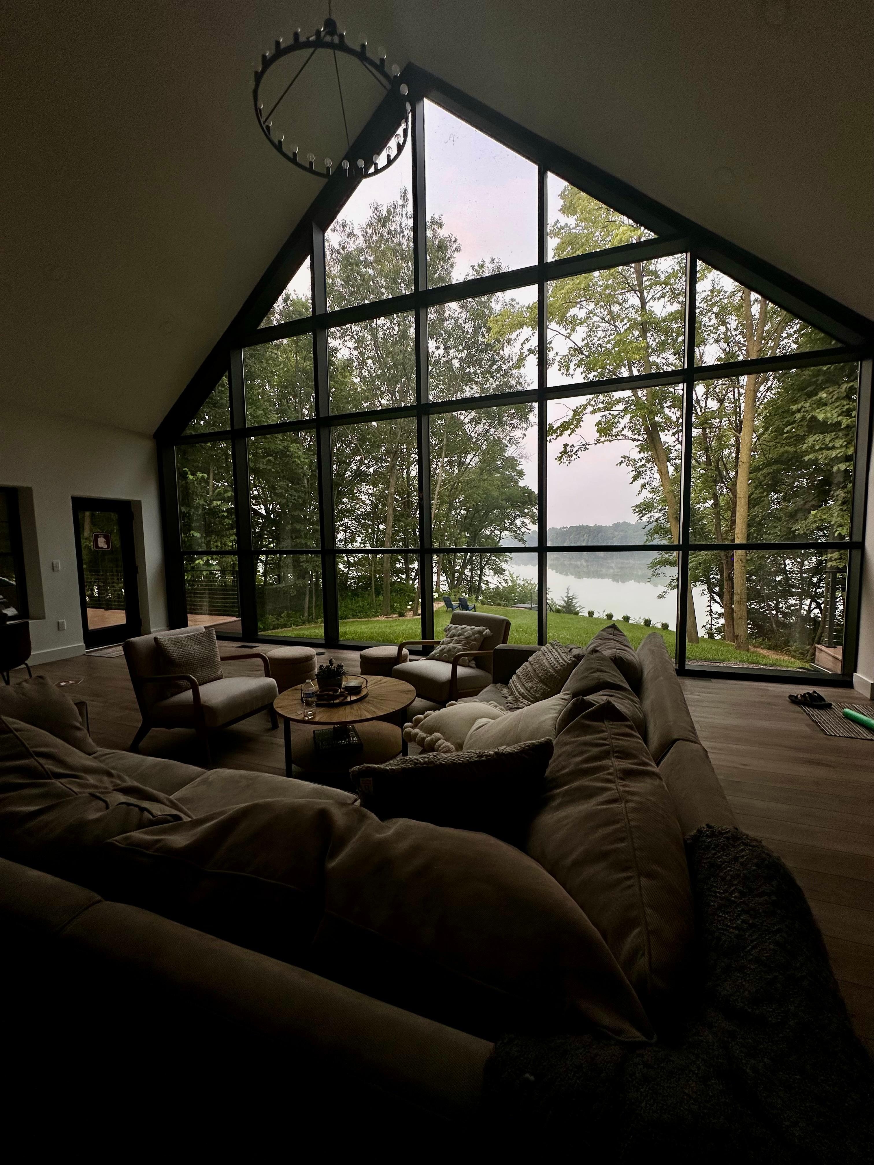 This is a gorgeous property with beautiful views, thoughtfully designed and artfully executed. There is plenty of space for a large gathering - we were 17, including 8 kids ages 4 - 15. There are many different hang out areas, so you never feel like you are on top of one another. We cooked most days, and the kitchen was well supplied and functioned well. The basement is great, especially for kids and teens (and adults who want to play). We had some crazy ping pong games, learned country line dancing in the theater room, had some fooz ball tournaments, and generally enjoyed ourselves! The landscaping was coming along - we were not able to access the lake easily, but there are several lakes near by with beaches. That said, our intrepid teenagers did take the paddle boat out from the house and had fun. As the owners continue to evolve the property I'm sure the lake will be even more accessible. The blackstone grill on the patio was a big hit - nothing like cooking 20 pancakes at the same time! All in all this is a great place - beds are comfy, showers are great, plenty of space for everyone in your crew and the most beautiful views of the lake from the great room.