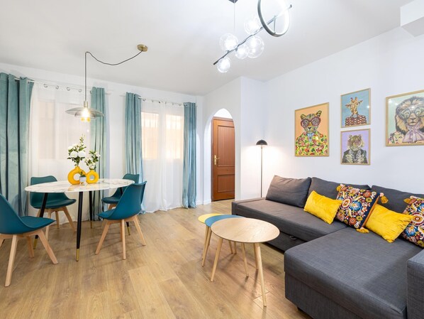 The apartment offers 1 bedroom with a double bed and a sofa bed in the living room for 2 people. The bathroom has a shower and the kitchen is fully equipped with a refrigerator, microwave, oven, washing machine, dishwasher, toaster, coffee maker, etc. It has air conditioning and free WiFi. It is very quiet and the views are to an interior patio. It offers a Smart TV, so if you have your Netflix, Amazon, etc. account, you can take advantage of it.