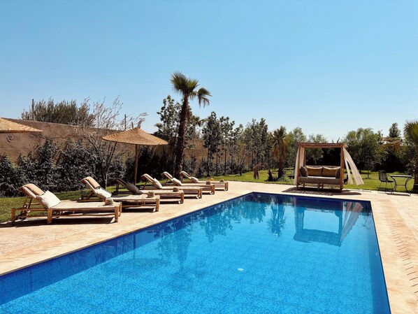 Composed of 3 beautiful bedrooms with their bathroom offering a warm space to all. A swimming pool invites you under the Moroccan sun.