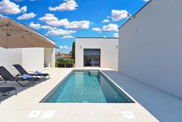 4 stars. LocationPula. The villa is located on a 115 sqm enclosed garden plot with meadow and shrubs, bordered by a fence. The landlord does not live in the house or on the property. Access is via a side road (asphalted). Parking is available on the property. Specialair conditioning, heating.Facilities: internet access (WLAN), iron and washing machine. TV reception takes place via satellite. PoolAll pools are available for exclusive use. Outdoor pool (usable from early May to early September, 3 m x 7 m, depth 1,5 m). WellnessSauna. Dogsnot allowed. DistancesShopping 1000 m, restaurant 1000 m, town center 2,5 km. Pula: airport 15 km and discotheque 2,5 km. In summer: Adriatic Sea 900 m in Pula (beach 900 m in Pula featuring gravel, rocks and bathing plateaus). Pula: diving, water sports, boat rental each 1500 m. fishing 900 m. DivisionVilla, 1 floor, 3 rooms (including 2 bedrooms), 115 sqm, in total 4 beds. RoomThe entrance to your villa is located on the ground floor, is covered and leads directly into the vestibule. Living room (23 sqm) with sitting area, TV and access to the terrace (100 sqm, covered, garden furniture). Bedroom with 1 double bed and access to the terrace. Bedroom with 1 double bed, access to the terrace and Sauna, bathtub, shower. Cooking nook in the living room (15 sqm) with dining area (4 seats), electric stove (ceramic hob, 4 plates), oven, extractor hood, dishwasher, fridge (icebox), coffee machine, electric kettle and access to the terrace. Bathroom with washing machine, shower, 1 washbasin, WC and window. Bathroom with bathtub, shower, 1 washbasin, WC, hairdryer and in the bedroom with sauna. Terms of lease and pricesIncluded in the priceOutdoor pool, internet access, air conditioning, electricity, water, final cleaning, bed linen, hand towels, Wireless Internet access. Side costs-Additionally(Payable when booking)/local tax.Deposit:EUR 300,-/object.