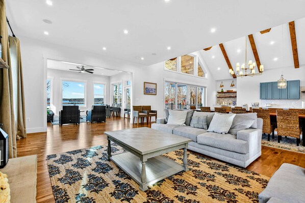 Highlighted by a wall of windows overlooking the lake, the great room showcases a lofty, open layout for comfortable indoor gatherings with friends and family. Happy hour fun awaits in the lower level game room equipped with a ping pong table and second kitchen. Stream your favorite shows on the smart TV in the great room.