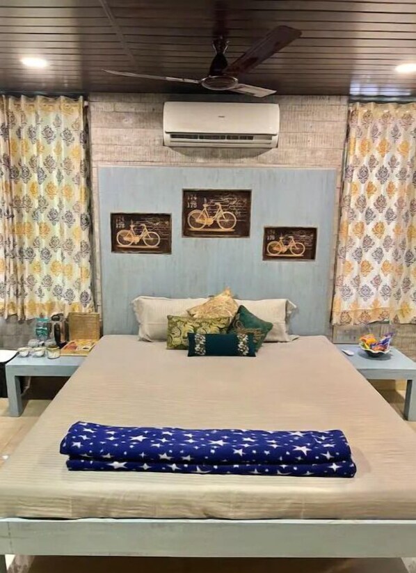 Step into the French-themed décor of this spacious room in a 2-storey villa, amidst lush greenery and a peaceful gated community. With big windows for natural light, direct access to a serene Greek-inspired terrace, and free WiFi, you'll feel worlds away from Mumbai's urban chaos.