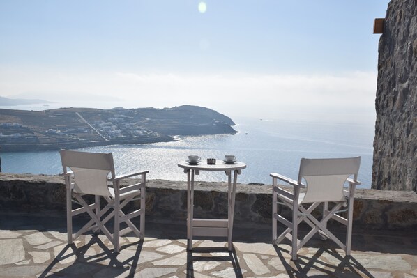 Outdoor, a private beachfront pergola shaded terrace, with breathtaking sea view on Kalo Livadi beach, offers to the quests a really enjoyable stay for relaxation, dining and fun.