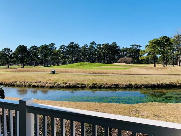 Good location, we liked watching the golfers. We also enjoyed seeing the ducks and turtles. Patio would have been nicer if it was cleaned, lots of spiders webs and spiders on the patio and inside the condo. Not sure what bite me every night but I woke up to at least one bug bite every day. I liked that it was first floor except for when the people upstairs came in, lots of foot thumping! Even though we liked the location I would not stay again due to bug bites.