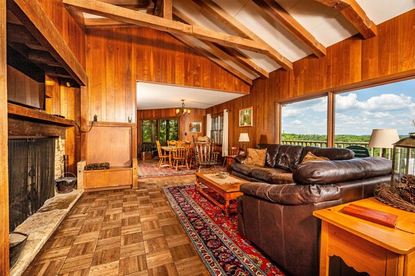 沈んだ木造のグランドルームにみんなを集めて活発な会話を楽しんだり、46インチのフラットスクリーンプレーヤーやブルーレイプレーヤーを楽しんだり、ロッキングチェアから素晴らしい景色を楽しんだりできます。 その後、ブラウンカウンティの石造りの暖炉で燃えているマンモスの木の周りで心地よく過ごして、夜の寒さを取り除きます。 フルキッチンがあり、大きなダイニングルームのテーブルは、食事、ゲーム、楽しみのために全員を席に乗せます! 3ベッドルームのうち2ベッドには専用のテレビがあります。 マスターベッドルームにはDVDプレーヤーがあります。