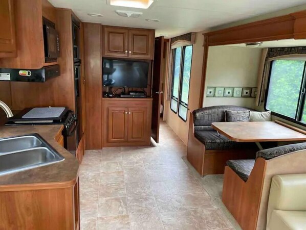This is a class A RV that is stationary. You have access to deck, hot tub and facilities in house. I can relocate the rv to different locations nearby for a separate fee. Good opportunity to try out RV to see how you would like it