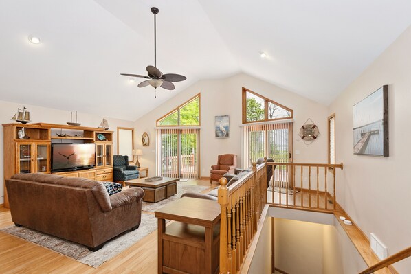 4 BR/3 BA (sleeps 12-14); This 2700 sq ft with finished basement lake house is sure to provide you with a great view and lots of fun! The main floor has an open concept kitchen. The great room has a vaulted ceiling with a beautiful view of the lake. Lots of windows to bring in natural light. The main floor has a Master bedroom with a full bath. It has large windows with a beautiful lake view. There are also two bedrooms on the main floor.
