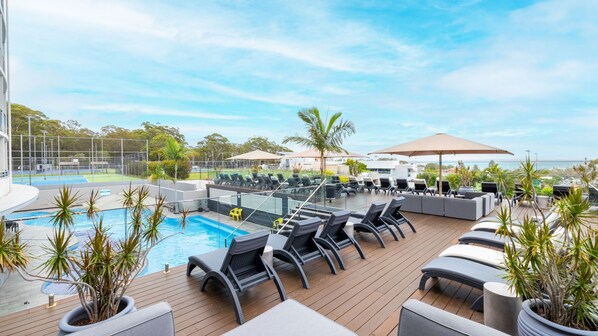 The unit has a private balcony which marks the perfect spot to kick back, drink in hand, as you gaze upon Nelson Bay's picturesque views. It is also overlooking the enticing outdoor pool and sundeck area fitted with sunlounges, tables and chairs where you can relax and read that favourite book.
