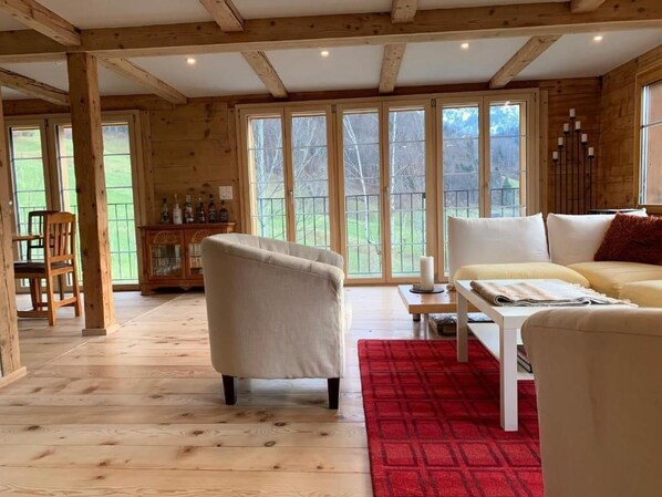 Garden: Large terrace 40 m2, natural swimming pond, barbecue area, lawn, further seating area (approx. 10 m2) with unobstructed view of the Churfirsten, the Speer and the valley. Garden furniture available. Private car park. Power cable (230V /16A) for electric car available.