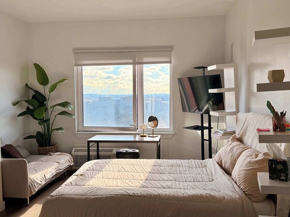 Experience a stylish, luxury studio retreat designed for solo travelers. Including in-wash and dryer in an elevator building. Enjoy city views, premium amenities and sleek design - just 10 mins for JFK / LGA and close to transit. Your go-to spot for quiet comfort and easy city access.