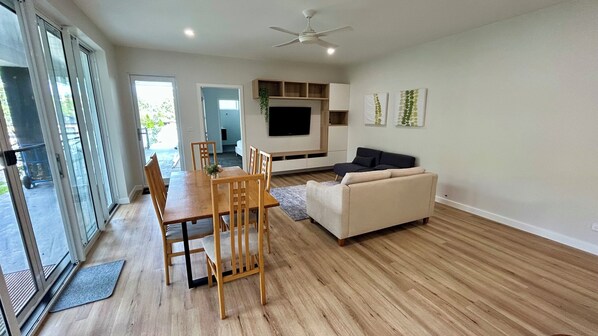 Inside, you'll find a spacious open-plan kitchen, living, and dining area, perfect for relaxing. The large windows and glass doors flood the space with natural light, creating a warm and inviting atmosphere. The sleeping arrangements are designed for comfort and flexibility, with a queen-size bed in the bedroom and two single sofa beds in the living room, ideal for children.