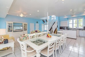 The spacious, open-concept great room links the large living & dining areas with kitchen. Glass doors provide seamless indoor/outdoor living allowing our guests to open the great room to the home's full-width, screened veranda on days when A/C is not necessary. Casual furniture, large TV downstairs, and dining for 10 in the screened porch. Two conversation areas (4-chairs w/ table) both inside screen porch and outside on pool deck.