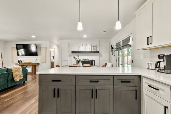 You won’t find dull knives or dollar-store dinnerware here—only quality cookware, sharp knives, matching place settings, and a fully stocked chef’s kitchen. Whether you’re prepping for brunch or a full tailgate spread, you’ll have everything you need.