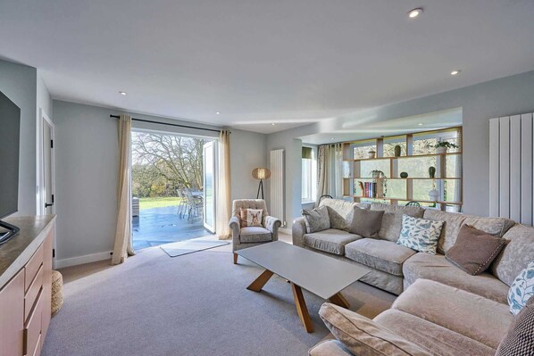 The living space features patio doors opening onto a large south-facing patio, along with a separate snug room equipped with a TV for relaxing. The Flat Screen TV adds additional entertainment for guests to enjoy during your stay. The home includes five bedrooms, designed for restful sleep with soft linens and comfortable furnishings, accommodating families or groups with ease. All king size beds can be made as twin beds, upon request. This property is easily accessible for guests wishing to use the downstairs bathroom and bedroom.