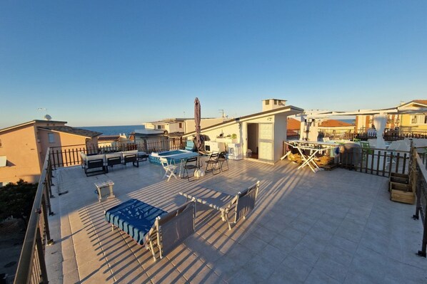 Entrance to the living area with double sofa bed and kitchenette equipped with induction hob and dishwasher - double bedroom - second double bedroom - third bedroom with two single beds - bathroom with shower and washing machine - 100m2 sea view terrace equipped with table and chairs, deckchairs, sofa, shower and barbecue. Air conditioning in the living area and in the double bedrooms. Wi-fi service. Pets not allowed.