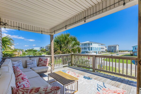 This 3 bedroom home on 1 level (up one flight of stairs), sleeps 8. Its open floor plan is perfect for family vacations. You enter the open concept living/dining/kitchen areas with the long continuous vertical grooves of the light sky blue plank ceilings, the windows flanking the west side & the sliding glass doors which create that coastal airiness that is so inviting. It is flooded with natural light & you can see the ocean (only 1 block away), before you ever put on your swimsuit. In the living area get comfortable on the sofa or 1 of the 2 upholstered chairs. Stream a movie, just add popcorn! The large coffee table is well suited to the wide variety of family friendly games to play or puzzles to be assembled. Perhaps you want to go on the front or back deck with your morning coffee & get lost in one of the several genres of beach reads to choose from. The dining table seats 8 & the kitchen bar seats 3. The kitchen is fully stocked including a Gas Stove, Drip Coffee Maker, Hot Water Pot, Blender, Immersion Blender, Mandolin, Hand Mixer, Indoor Tabletop S’more Maker & Stock Pot to make the low country seafood boils our coast is known for. There are 2 Seafood Boil Companies on the island where you can choose what seafood you want & they even include the seasonings & simple directions. Everything you need to create a memorable beach vacation meal. Whether caught or bought, put that fish on the charcoal grill downstairs for a little extra flavor. The front deck has an ocean view with large sectional seating. The back deck’s view is towards the marsh & the Davis Canal. There are 2 Adirondack chairs & a table seating 4 for alfresco dining.
