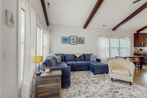 This spacious home is stocked with everything you need for a stress-free beach vacation. Beach chairs, towels, toys, coolers, and sunshades are provided so you're ready for long, relaxing days by the water. Inside, the open living area features comfortable seating and a sofa bed, perfect for extra guests or lounging after a day in the sun.