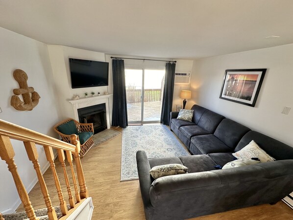 2 Bedroom, 1.5 bath, fully updated condo located on 145th street, in a quiet area directly across from the Fenwick Lighthouse in North Ocean City. Beautifully updated with modern decor yet a cozy beachy feel, just a short walk to to the beach, mini-golf, Both family style and gourmet restaurants, playgrounds and ecological parks, bus stop , bars, ice cream, go-carts, popcorn, shopping, water sports, kayaking , you name it.. it’s all at your fingertips! Park your car because you won't need it here. But if you do need your car, we have two spots available plus ample free parking on the streets. Both bedrooms are nestled upstairs, each having their own TV with cable. Easy to access Internet, light airy feeling throughout the house and always a view of the lighthouse. Nice breeze with the windows open and air conditioning throughout. Kitchen is fully stocked, one room has a queen comfortable bed with plenty of pillows and the other bedroom has two comfortable twin beds, and pillows . Comforters are provided. A large deck on the first floor off the family room is perfect for enjoying dinners, an afternoon lunch or break from the sun, morning coffee, a drink after the beach, and a private quiet grassy yard for yard games and kids to play in . One of our favorite things to do is watch the lighthouse from the deck light up at night , you can even see this while on the sofa, watching TV! ! Very safe, quiet area. 3 grocery stores located nearby. Short 5 minute walk to the beach. We have owned this lovely condo for 12 years and are also locals, we would be glad to give any recommendations for our favorite restaurants, activities, attractions, but mostly this is a very relaxing vacation! Nothing like hearing and smelling the ocean and salt air. We hope you find our home as comfortable and enjoyable as we do! It’s a gem!