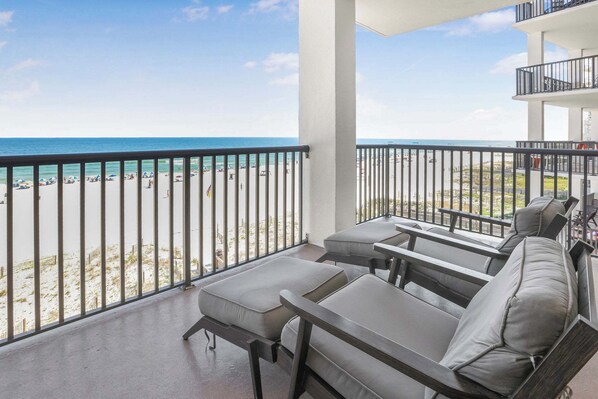 The spacious living room features a comfortable queen size sleeper sofa, a 60' 4k HD smart TV and a DVD player. Both the living room and master bedroom open directly onto the large wrap-around balcony which offers spectacular views of the white sandy beach and the beautiful turquoise water of the Gulf of Mexico. This corner unit gets wonderful natural light and captures panoramic views. The balcony features Pollywood Adirondack table and chairs, creating a comfortable and tranquil lounging space.