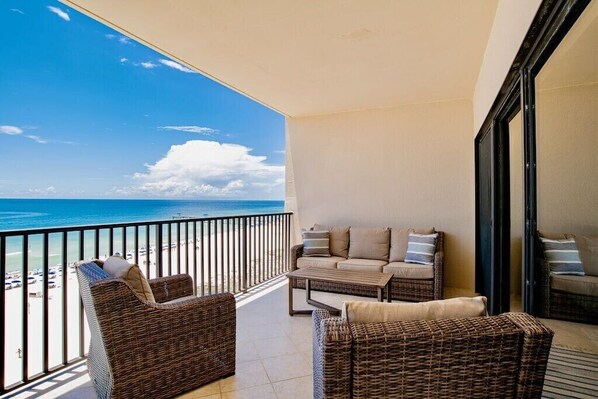 Oversized beach front deck with comfortable outdoor seating!