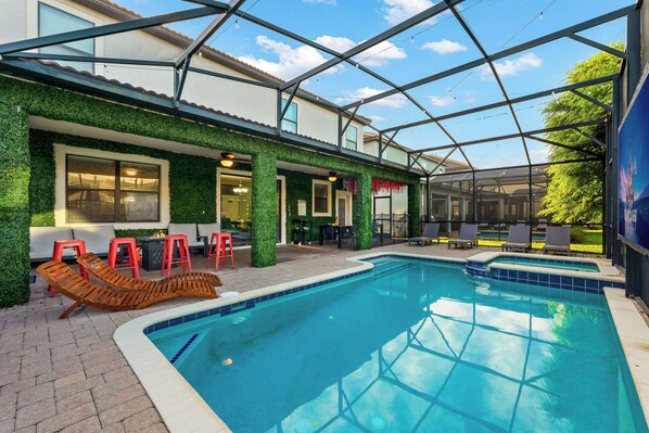 Private Outdoor Pool & Spa Step outside to your very own backyard oasis. The screened-in private pool and spa provide the perfect setting to unwind in the Florida sun or cool off after an adventure-filled day. Lounge poolside, soak in the hot tub, or enjoy a family barbecue under the covered patio area.