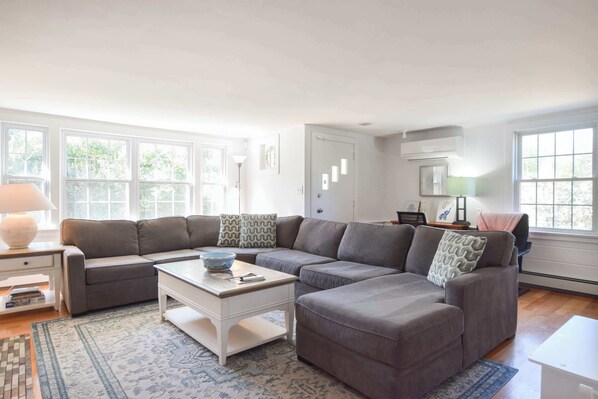 Past the dining room, you will find the home’s great entertainment space, the living room. Standing in the living room, the waters off Skaket Beach are visible in the close distance, beckoning you to leave your incredible vacation home and jump in the salt water of Cape Cod Bay. If you decide to stay in, you can relax on the expansive sectional, or pick from an endless supply of board games on the shelf towering to the left of the huge TV.