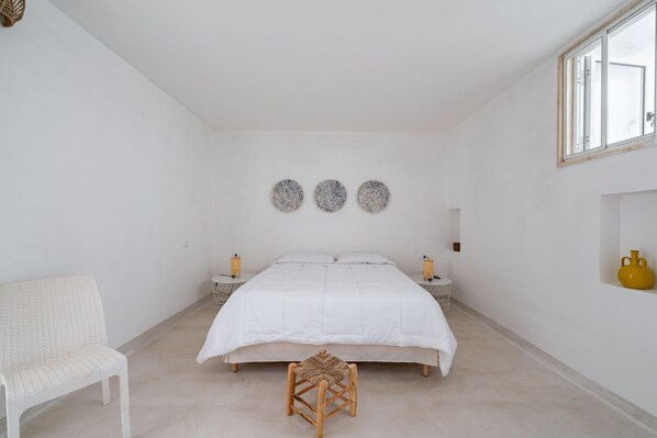 The master bedroom is furnished with an elegant double bed, and the interior bathroom, with a modern design, offers comfort and practicality.