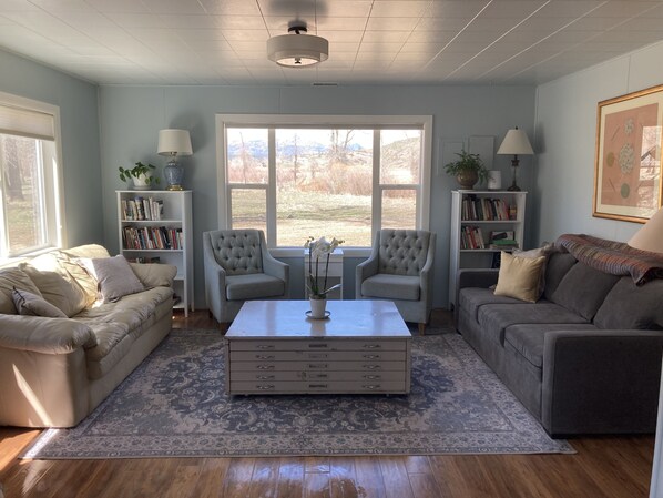 The River Cabin sits just 50 yards from the river, surrounded by cottonwood trees. The 600 square-foot cabin is cozy and peaceful, with huge picture windows that look out on the river and the mountains. It’s the perfect place to unwind and unplug, and it is a truly magical place in any season. Take a walk around the ponds or hike up into the woods. Do some fishing (license required to fish the river). In spring or summer you can take a paddle on the ponds, or float the river from one end of the property to the other (kayaks and tubes available for guest use). In the winter you can snowshoe or cross-country ski on the property. Read a book in the hammock, play a board game by the fire, write your memoir. Watch elk out the window. There is wifi in the cabin, but who says you need to use it?